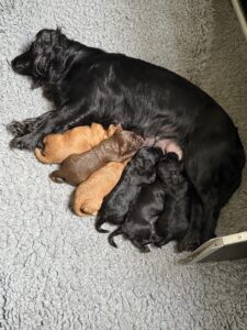 Bournepark Alicea had a new litter of pups, 2 males and 4 females born 21st July 2025, 3 black and 2 red pups and 1 liver. All have growing and we are delighted with them.